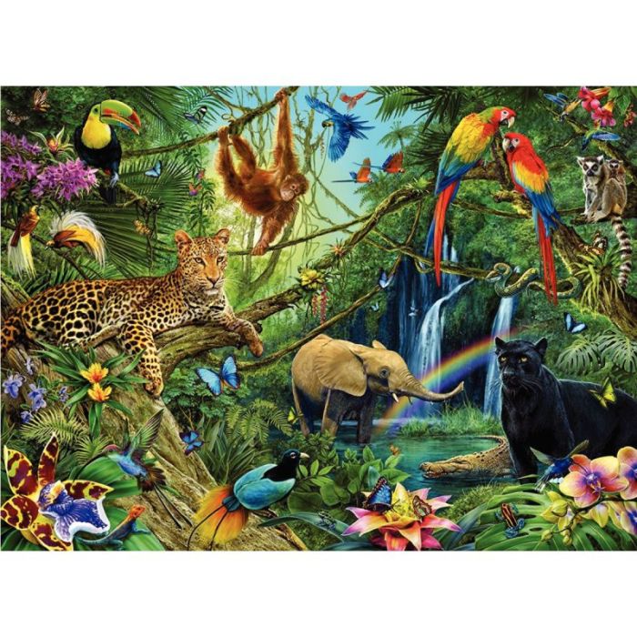 Puzzle en carton épais de 200 pièces aux couleurs vives, aux illustrations soignées et détaillées représentant une multitude d’animaux sauvages dans la jungle