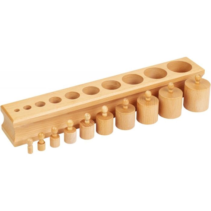 Bloc en hêtre naturel top qualité contenant 10 cylindres en bois pourvus d’un bouton de préhension pour une prise en main facile par les enfants
