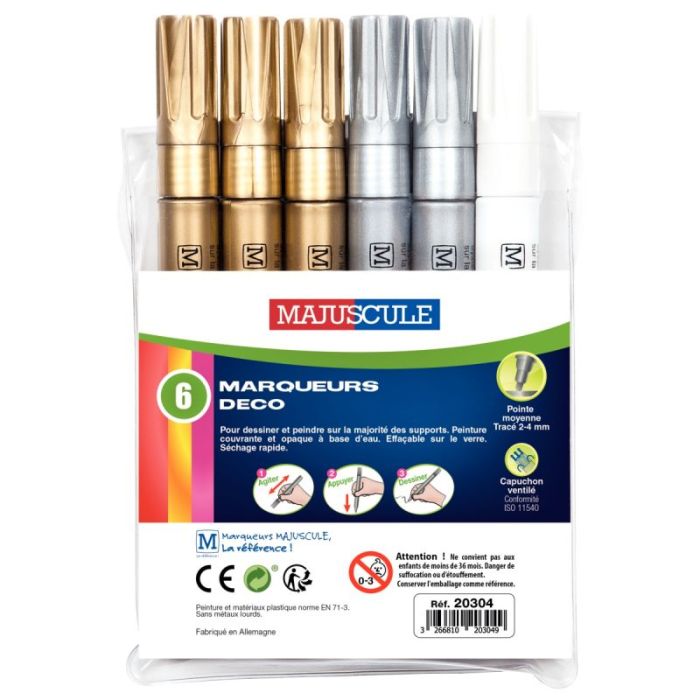 Pochette de 6 marqueurs peinture pointe moyenne or, argent et blanc
