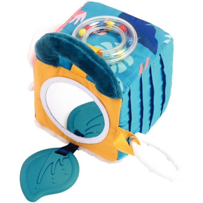 Cube d’activités en tissu tout doux léger avec différentes textures à explorer et décoré sur le thème de la jungle