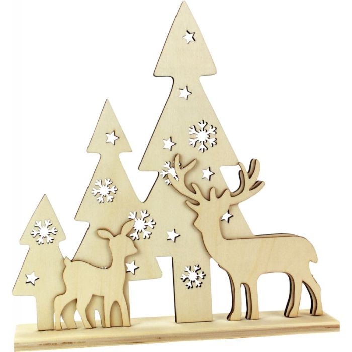 Décor de Noël sur socle avec 3 sapins ajourés, un renne et un faon