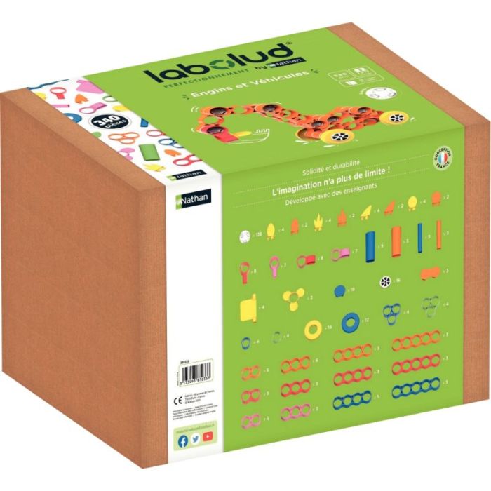Contient : 340 pièces en plastique dont 28 roues (22 formes de 1, 2 ou 3 couleurs), 12 fiches modèles recto/verso format A4 et 1 tableau récapitulatif des modèles format A3