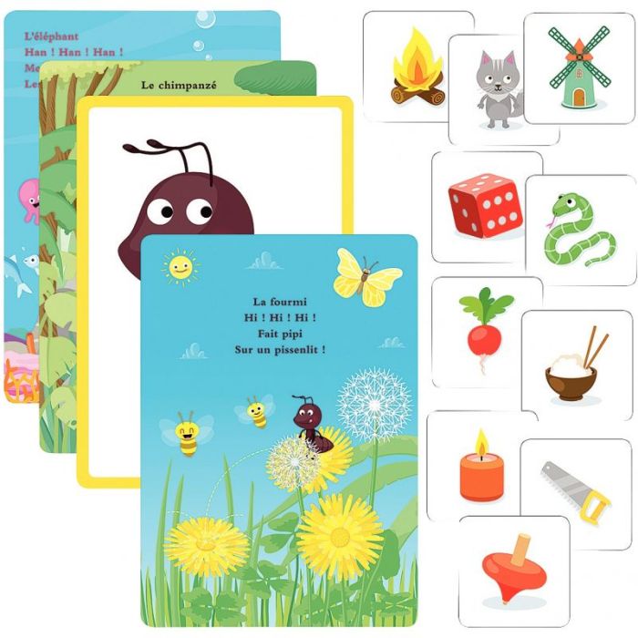 La boîte contient : • 10 cartes comptines illustrées recto verso (21 x 29,7 cm)