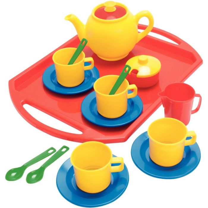 18 pièces en plastique résistant : 1 plateau, 4 tasses, 4 sous-tasses, 4 cuillères, 1 sucrier avec couvercle, 1 pichet à lait et 1 cafetière avec couvercle