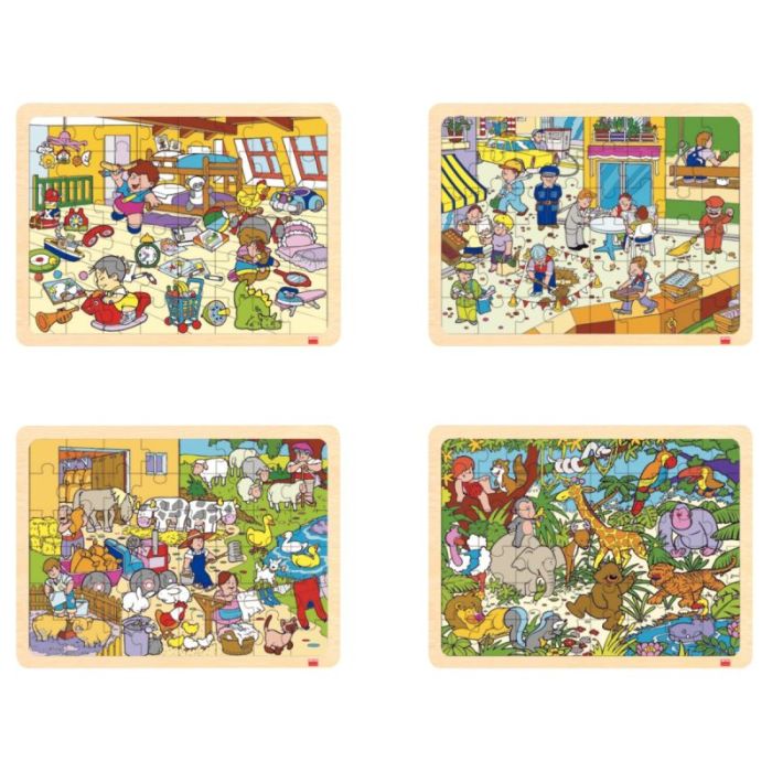 Chaque puzzle est composé d'1 plateau et de 48 pièces en bois aux couleurs vives sur 4 thèmes divers : le centre-ville, la ferme, la savane et la crèche.