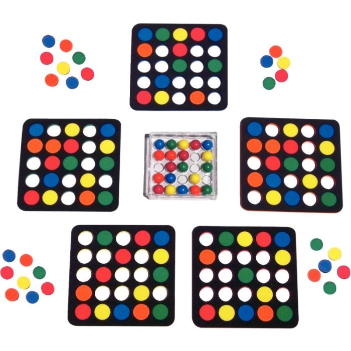 Contenu de la boîte : un boulier scellé en PVC avec 20 billes de couleurs, 5 plaques perforées en EVA et 125 pions de 5 couleurs différentes
