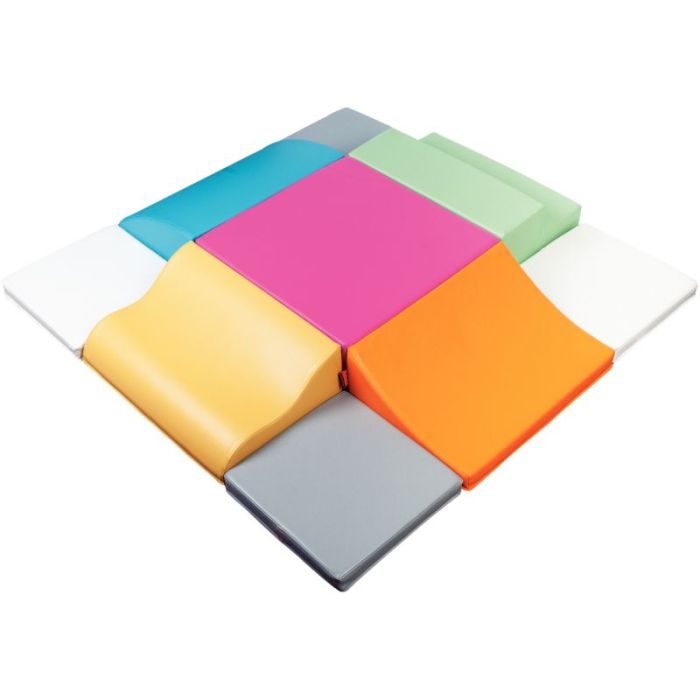 Contenu : 4 tapis 40x40cm, 1 cube L 60 x l 60 x H 20cm, 1 escalier, 1 vague, 1 glissade, 1 rampe L 60 x l 40 x H 20cm