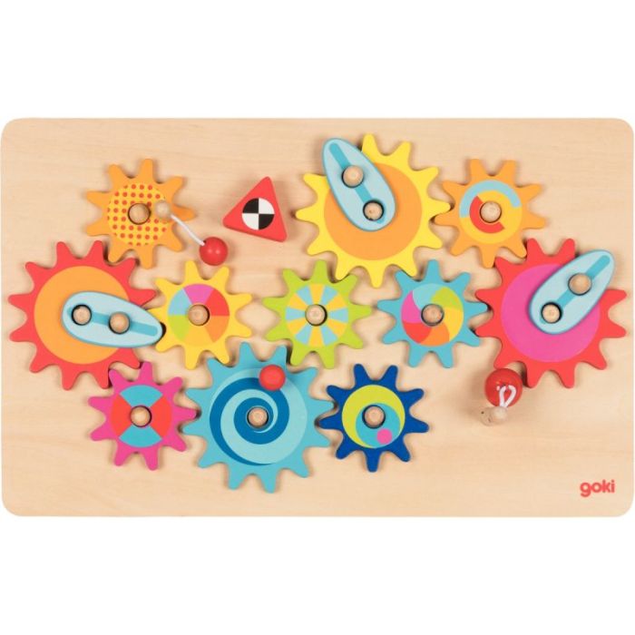 Encastrement original constitué d'1 plateau et de 11 roues dentées en bois multicolore à positionner sur les tiges du plateau pour former un engrenage en mouvement avec effets visuels kaléidoscope.