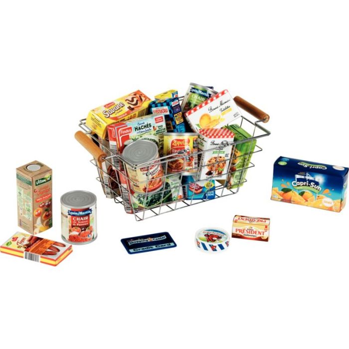Panier en métal résistant avec 2 poignées rabattables en bois, une carte bancaire en plastique et de nombreux produits d’épicerie (boites factices en carton).