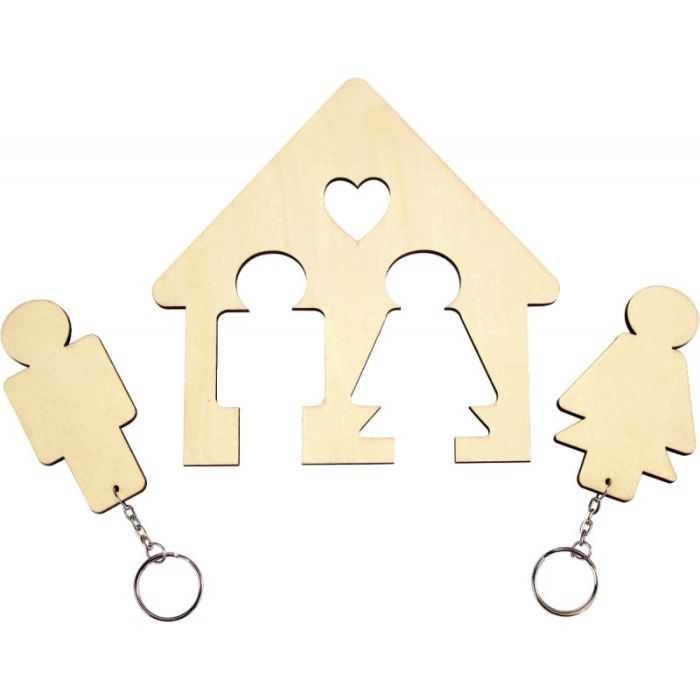 Range clés original en forme de maison avec une découpe cœurs et 2 porte-clés amovibles en forme de personnages