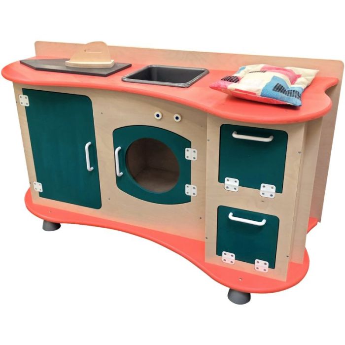 Avec 1 armoire et 2 tiroirs de rangement, 1 lave-linge, 1 penderie, 1 table à repasser et son fer, 1 baignoire et 1 matelas à langer