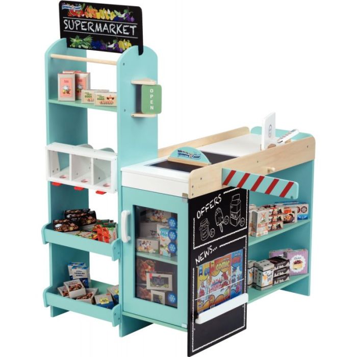 Meuble en bois MDF équipé de plusieurs étagères de rangement, 1 réfrigérateur, 1 tableau noir, 1 terminal de paiement amovible, 1 caisse enregistreuse, 1 distributeur d’épicerie fine, 1 barrière à ouvrir et à fermer… A monter soi-même.