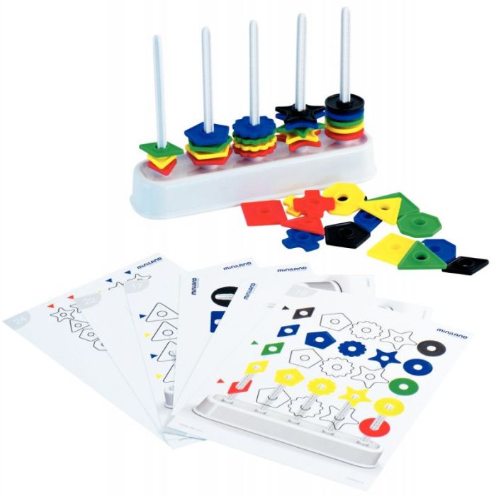Cet ensemble est constitué d'une abaque à 5 tiges, de 100 pièces de 10 formes et 5 couleurs assorties et de 12 fiches imprimées recto/ verso 16x8 cm