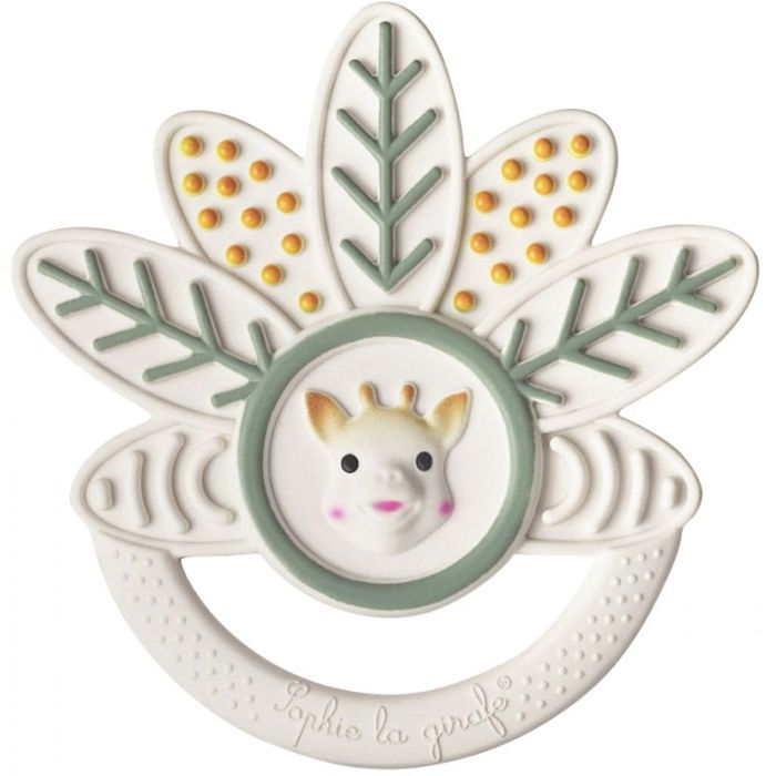 Hochet souple et doux au toucher en caoutchouc 100% naturel avec une poignée de préhension et 7 feuilles texturées à mordiller