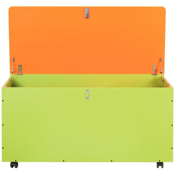 En stratifié de 18 mm pour les côtés et de 12 mm pour le devant et l’arrière, équipé de 4 roulettes, et d’une fermeture à cadenas