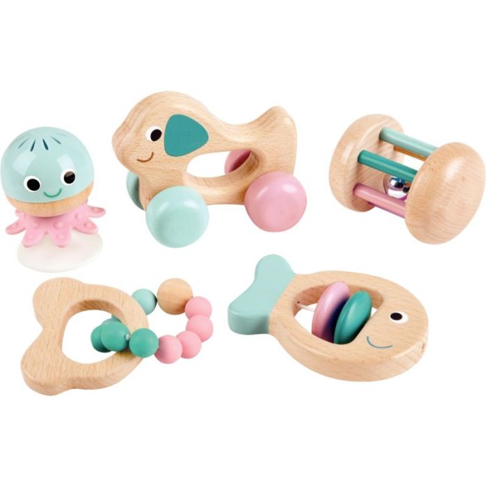 Hochets en bois naturel et coloré certifié FSC, faciles à saisir par les petites mains pour divertir et éveiller les sens de bébé : un anneau de dentition avec des perles en caoutchouc à mordiller, un chien à pousser, une pieuvre ventouse, un rouleau à grelot et un poisson musical à agiter.