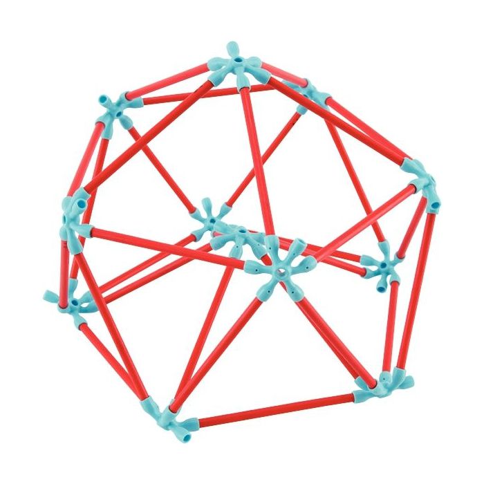 Contient 133 pièces à assembler : 28 raccords en silicone flexible bleu (roues et coins) et 105 bâtonnets rouge de 3 longueurs différentes en bois de bambou léger et très résistant