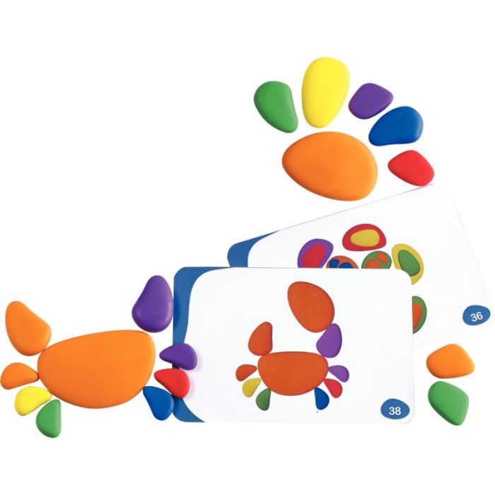 Contenu : 36 galets de 6 tailles et 6 couleurs assorties, 20 fiches d’activités recto verso