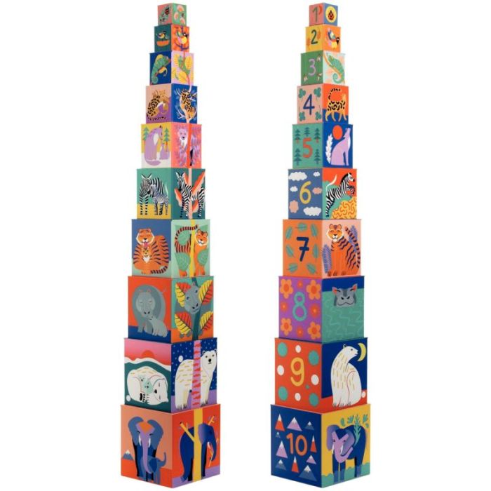 10 cubes gigognes en carton fort à empiler ou à aligner pour reproduire 5 suites logiques sur le thème des animaux sauvages